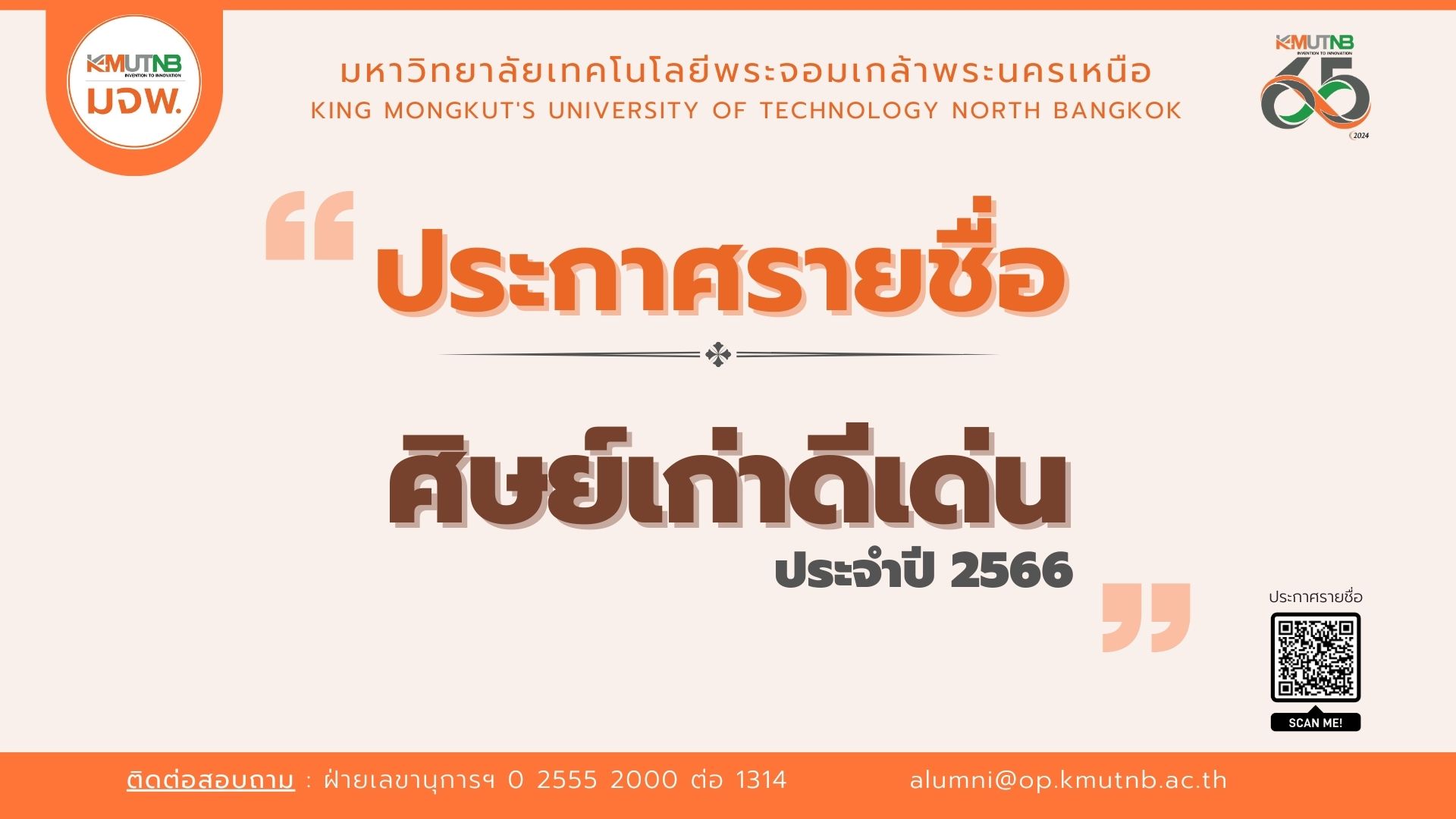 ตามที่มหาวิทยาลัยเทคโนโลยีพระจอมเกล้าพระนครเหนือได้ ดำเนินการคัดเลือกศิษย์เก่าดีเด่น ประจำปี พ.ศ. ๒๕๖๖ ซึ่งเป็นผู้ที่สำเร็จการศึกษาในระดับต่าง ๆ ของมหาวิทยาลัยเทคโนโลยีพระจอมเกล้าพระนครเหนือ ที่มีคุณสมบัติและผลงานดีเด่น เป็นที่ประจักษ์ในสาขาที่กำหนด เพื่อยกย่องเชิดชูเป็นตัวอย่างให้แก่นักศึกษาและบุคคลโดยทั่วไป นั้น