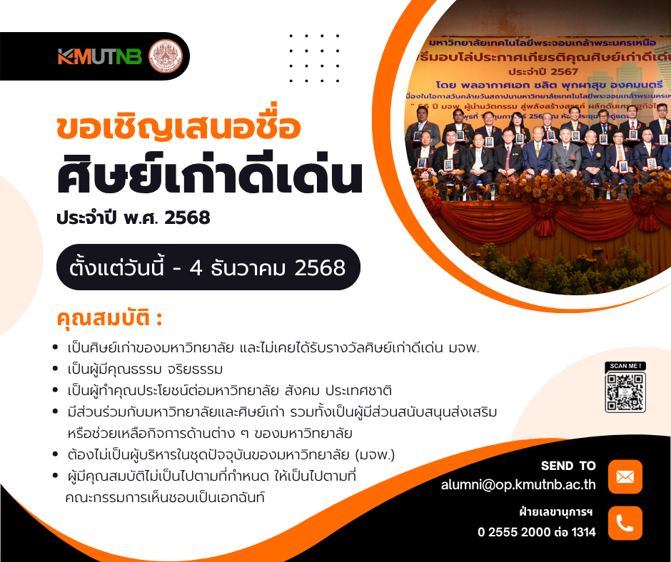มจพ. ขอเชิญเสนอชื่อศิษย์เก่าดีเด่นประจำปี พ.ศ. 2568 เนื่องในวันคล้ายวันสถาปนามหาวิทยาลัยครบรอบ 67 ปี